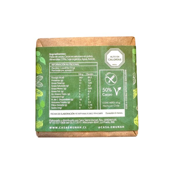 “Chocolate vegano gourmet con almendras y 50% cacao ecuatoriano.”