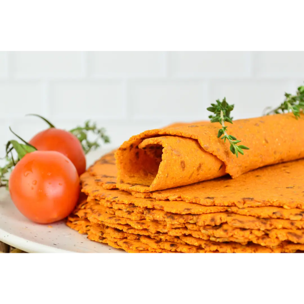 Cetortillas Mediterráneas tamaño XL (18 cm), elaboradas a base de harina de coco, tomates deshidratados y aceite de oliva. Sus ingredientes limpios y reales la hacen apta para todos.