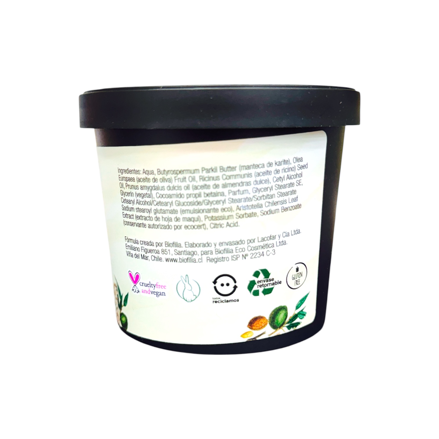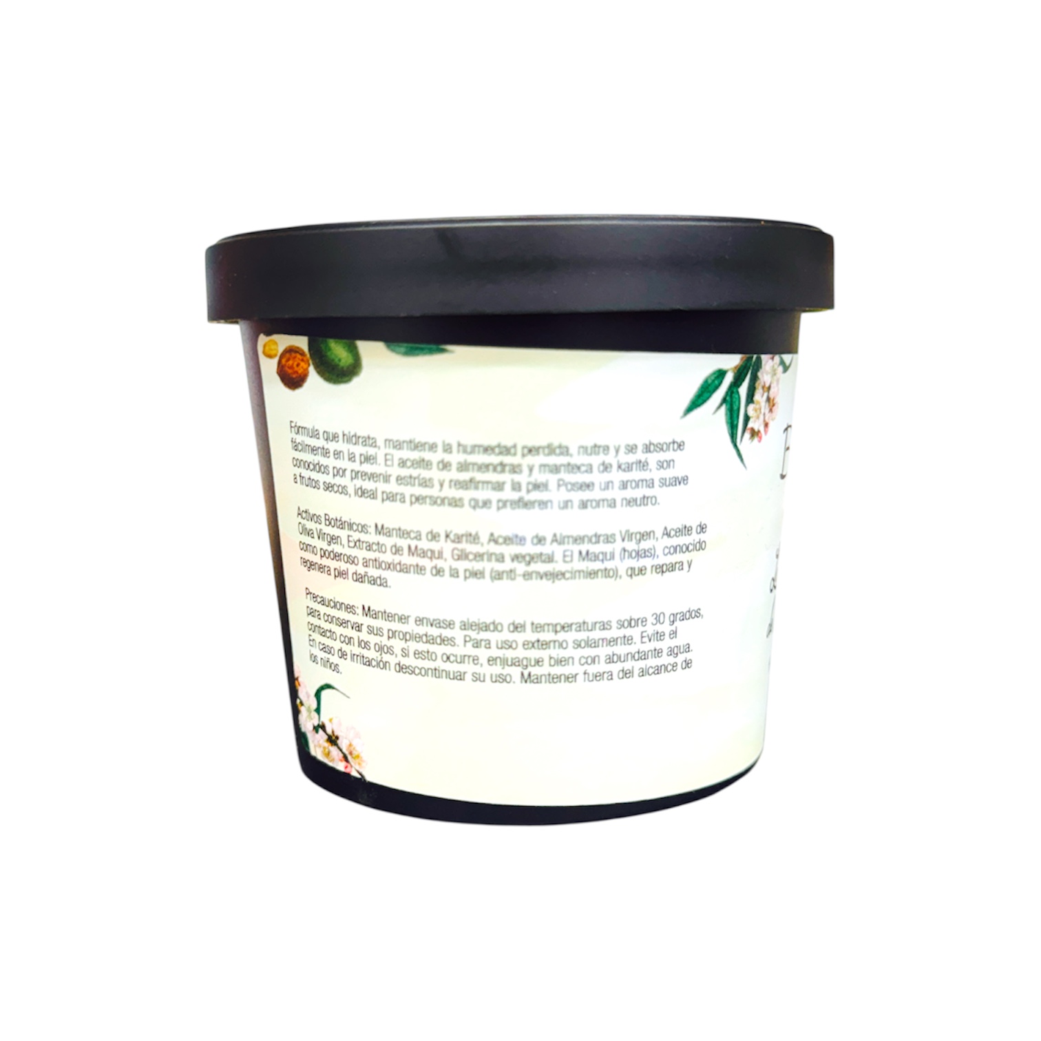 Activos Botánicos: Manteca de Karité, Aceite de Almendras Virgen, Aceite de Oliva Virgen, Extracto de Maqui, Glicerina vegetal.