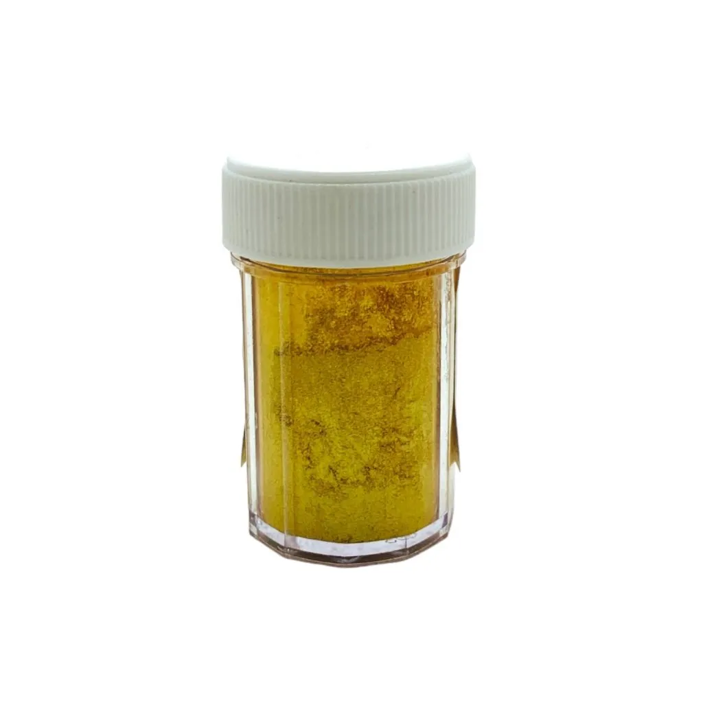 Pigmento dorado perlado de acabado satinado, perfecto para maquillaje y productos cosméticos iluminadores.