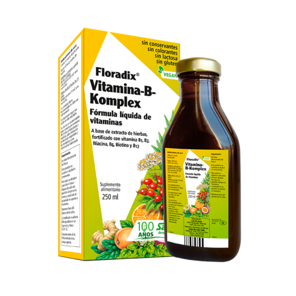 Floradix Vitamina-B-Komplex contiene vitaminas del complejo B que toman parte en una multitud de importantes procesos metabólicos dentro del cuerpo, y contribuyen considerablemente a la salud y el bienestar en general. La dosis diaria, provee el cuerpo con cantidades suficientes de las vitaminas B1, B2, B3, B6, B7 y B12.